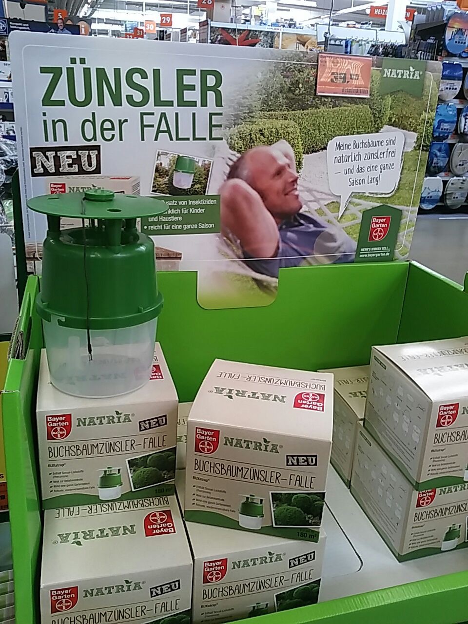 Man könnte meinen ein jeder bekommt den Garten den er verdient, von Natur ist auf dem Bild sowieso wenig zu erkennen. Wenn da nicht noch der Preis für´s Gartenglück wäre: Stolze 39,99 € verlangt der Gartenhandel für eine Plastikfalle und ein Pheromonpräparat! Das ist nicht nur ärgerliche Beutelschneiderei, gemeinhin auch als Nepp bezeichnet: Auch das Versprechen selbst ist falsch, Lockstoffe als Bekämpfungsmethode für Buchsbaumzünsler funktionieren nicht. Es handelt sich also um irreführende Werbung.