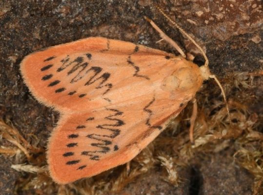 - Falter des Rosen-Flechtenbärchens Miltochrista miniata, welches nach über 90 Jahren erstmals wieder in Düsseldorf nachgewiesen wurde. Das fotografierte Tier stammt aus einer Eizucht eines am 28.6.2022 in Aachen gefangenen Weibchens. Foto L. Wirooks.