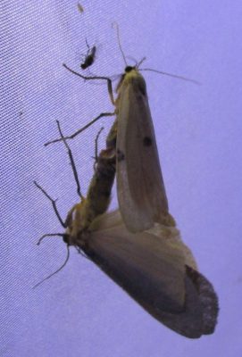 - Eine Paarung des Vierpunkt-Flechtenbärchens Lithosia quadra am Leuchtturm, fotografiert in der Nacht vom 30.06. auf den 01.07.2025 im Eller Forst. Foto L. Wirooks.