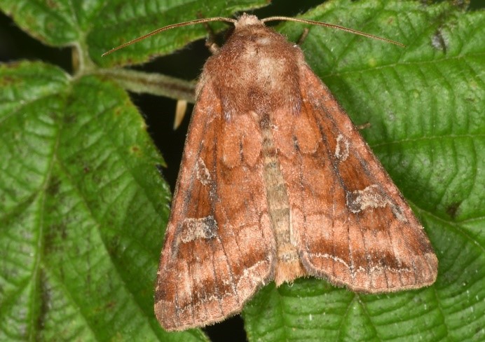 Das Foto zeigt die am 30.06.2025 im Eller Forst gefangene Feuchtwiesen-Kräutereule Lacanobia splendens, welche dabei erstmals überhaupt in Düsseldorf nachgewiesen werden konnte. Foto L. Wirooks.