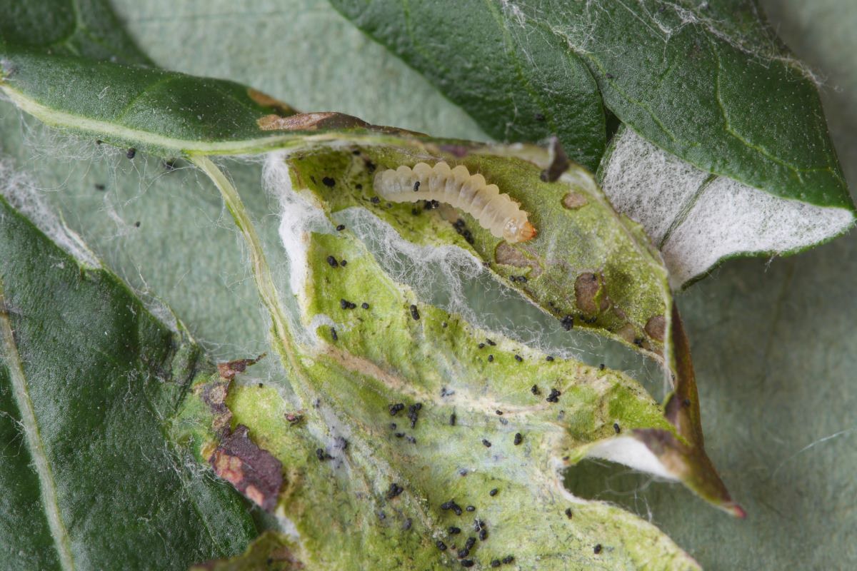 Geöffnete Blasenmine mit Raupe von Leucospilapteryx omissella , Stukenbrock, 13. September 2015. (Foto: Dieter Robrecht)