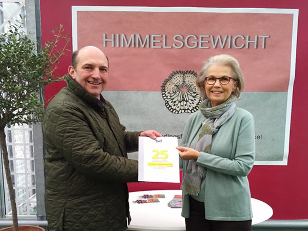 Da Fürstin Gabriela die Auszeichnung für die 25 jährige Mitgliedschaft in der Arbeitsgemeinschaft der Rheinisch- Westfälischen Lepidopterologen anlässlich der Jahreshauptversammlung am 20. März 2016 nicht persönlich entgegen nehmen konnte. wurde der Schmetterlingsfürstin im Garten der Schmetterlinge, aus der Hand von Thomas Carl Reifenberg, die Urkunde und die Silberne Vereinsnadel übereicht.