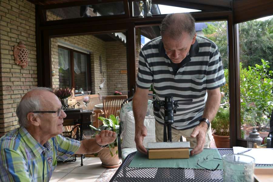 Perfektionisten bei der Arbeit: Heinz Schumacher und Dieter Robrecht beim ablichten von „Mikros“. 3. September 2016 (Foto: Armin Dahl)