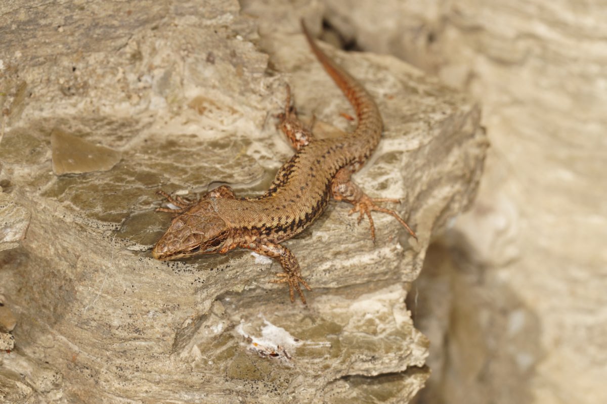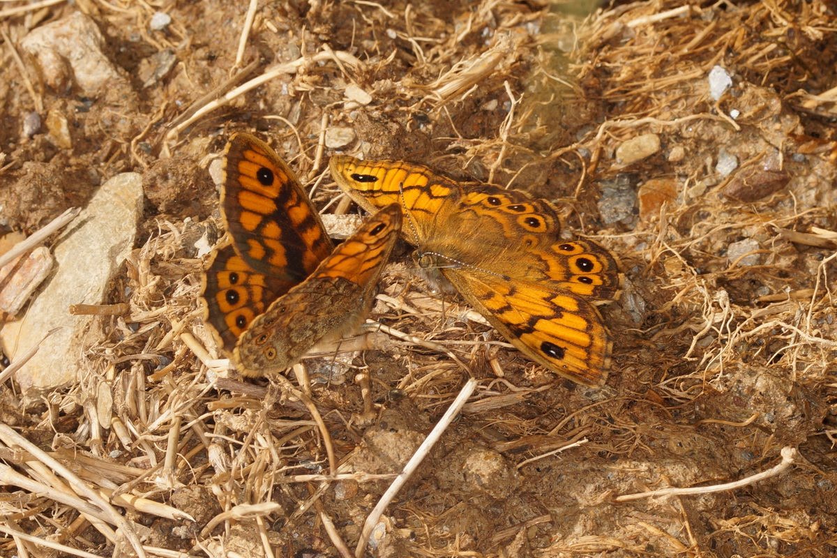 Der Samstag startete dann mit Nebel im Tal, der rasch in einen strahlend schönen Frühsommertag überging. Vom Treffpunkt auf dem Sattel bei der „Moselloreley“ zwischen den Weindörfern Piesport, Minheim und Wintrich ging es in fünfstündigem Exkursions-Schleichgang an der Oberkante des imposanten, 85 Meter senkrecht zur Mosel abfallenden Schieferfelsens entlang, durch Weinberge, Brachen und kleine Streuobstwiesen. Offenbar waren zahlreiche Falter während des Wetterumschwungs frisch geschlüpft, die Temperaturen moderat, so dass sich den Fotografen reichlich Motive boten. Die Liste der beobachteten Arten erschien mit knapp 60 Formen schon einigermaßen zufrieden stellend, darunter fanden sich auch sehr selten gemeldete Formen wie der Große Sackträger Canephora hirsuta (PODA, 1761). Äußerst erfreulich waren während der gesamten Exkursion die hohen Individuenzahlen vom Mauerfuchs Lasiommata megera (LINNAEUS, 1767), der auch überall in den – meist wechselzeilig begrünten – Rebflächen flog.