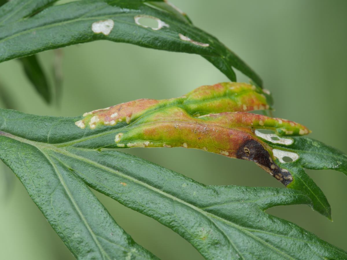 Die roten Blasenminen der zu den Echten Miniermotten (Gracillariinae) zählenden, winzigen Art sind sehr auffällig und können bei der herbstlichen Minensuche eigentlich nicht übersehen werden. Und so gelang mir der Nachweis in der Senne an drei Standorten in Stukenbrock (Kreis Gütersloh), Oerlinghausen (Kreis Lippe) und Bielefeld-Sennestadt. Die rötliche Blasenmine darf nicht verwechselt werden mit der Fliegenart Trypeta artemisiae (Fabricius, 1784). Diese Minen sehen schwärzlich aus und sind weniger aufgeblasen. Abbildungen und Hinweise finden sich auf der Webseite bladmineerders.nl/