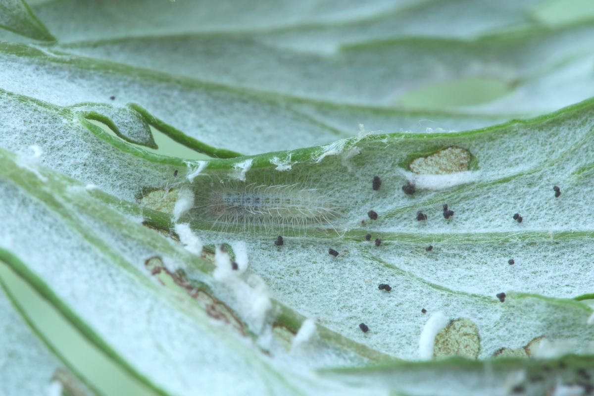 Eine weitere Art, die bislang selten in unserem Arbeitsgebiet nachgewiesen wurde, ist Hellinsia lienigianus (ZELLER, 1852). Die Raupe zieht als Schutz vor Fressfeinden und Raupen-Parasiten die Endspitze eines Beifuß-Blattes zusammen, die dann gerollt aussieht. Eher zufällig entdeckte ich zunächst eine Raupe Anfang September, da Bucculatrix noltei an dem Blatt schon gefressen haben musste, jedoch das zusammen gerollte Blatt untypisch war. Die Raupe der Federmotte befand sich dann in dieser Blattrolle. Weitere Raupen konnte ich in Sennestadt, Oerlinghausen und Stukenbrock jeweils Anfang bis Mitte September finden.