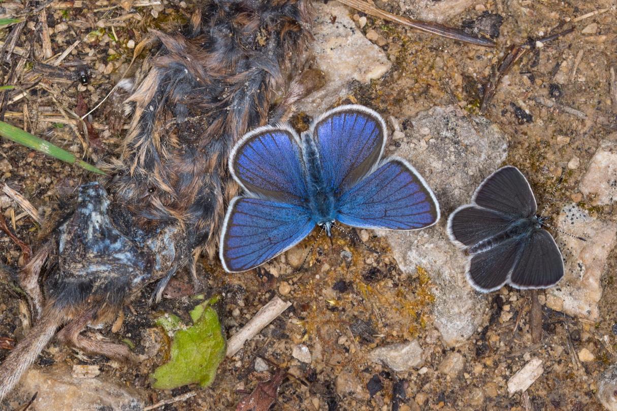 Lecker tote Maus: Cyaniris semiargus – Rotklee-Bläuling und Cupido minimus – Zwerg-Bläuling saugen das auf, was aus einer toten Maus herausläuft – puh! (Schönecken, 19.05.2019, Foto: Tim Laußmann)