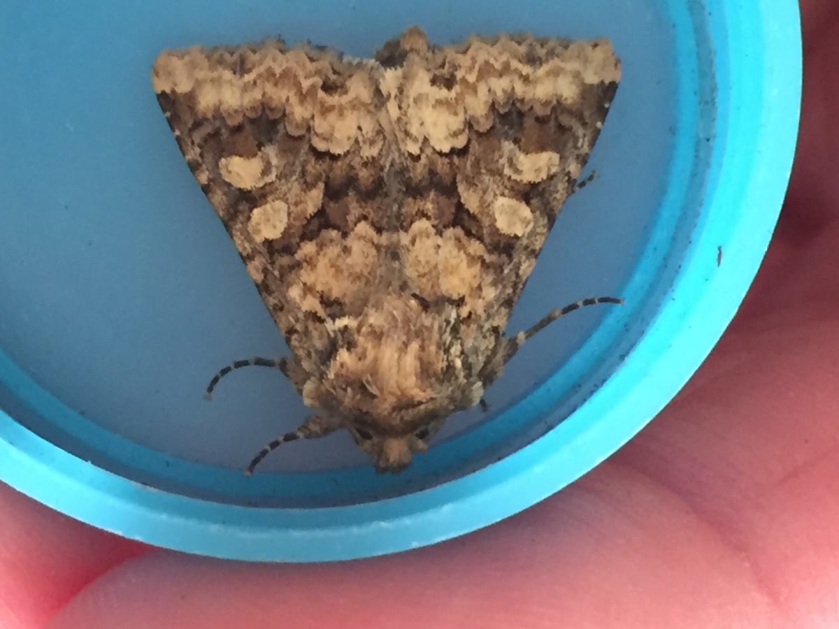 Der Abend entwickelte sich wie erwartet, schon um Mitternacht waren etwa 100 Makro- und Mikrolepidoptern registriert, darunter die für Steppen- und Felsheide typische Kammerjungfer Dysauxes ancilla und selten nachgewiesene Arten wie das Hellgraue Graueulchen Meganola strigula. Nach Mitternacht kamen dann in rascher Folge die moseltypischen „Highlights“ ans Licht, unter anderen Dichagyris forcipula, Dichagyris candelisequa und Chersotis multangula, alle drei in Felsgeröllhalden zu finden.