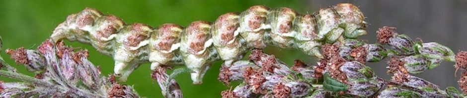 und für die nun Angespornten: es lohnt sich weiterhin auch in den nächsten Tagen nach den Raupen zu suchen, ich habe erst heute zwei noch nicht erwachsene Raupen an Artemisia vulgaris im Norden Wuppertals gefunden. Dabei waren die Raupen vergleichsweise leicht zu finden, da sie auf nicht mehr ganz frischem Beifuß, dessen Blüten schon recht braun waren, saßen.