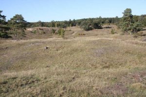 Wie gesagt: Von dieser sommerlichen Blütenpracht ist an diesem 21. September nicht mehr sehr viel zu sehen. Von der Anhöhe des Schlangenbergs (276 m) blickt man auf eine eher steppenähnliche Pflanzenstruktur hin. Einzelne Kiefer stehen im Gelände, nach Osten hin begrenzt das Gebiet ein Wald mit Saum aus Kiefern und Birken, davor gedeiht in einzelnen Büschen das Heidekraut (Calluna); nach Norden sind Fichten und Buchen zu erkennen. Im Übergang von Waldsaum zur Grasfläche gedeihen einzelne Sträucher (Schlehe, Rose, Brombeere…).