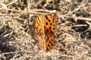Gewiss, die meisten Blüten sind verschwunden. Aber noch immer duften dezent einige Thymian-Polster in der Sonne, hier und da blüht noch das gelbe Galmei-Veilchen, der violette Kopf von Flockenblumen lockt noch das eine oder andere Insekt. Unter den Schmetterlingen ist an diesem 21. September der Kleine Feuerfalter (Lycaena phlaeas) der häufigste Falter, meist sind seine Farben noch sehr frisch. Das Kleine Wiesenvögelchen (Coenonympha pamphilus) verhält sich viel diskreter, auch der Gemeine oder Hauchhechel-Bläuling (Polyommatus icarus) hält mehr von Ungestörtheit als von Zurschaustellung. Aber sie sind da … Und dann fliegt noch entlang der sonnigen Flanken des Schlangenbergs ein Gelbling (Colias alfacariensis). Mehr noch: eine halbe Dutzend Postillionen (Colias croceus) eilen dort und patrouillieren und wenden. Und setzten sich gegen Ende des Nachmittags an nektarspendende Blüten. Die größere Überraschung liefern die Kleinen Perlmuttfalter (Issoria lathonia). Sie sonnen sich, besuchen manchmal eine Blüte, fliegen eifrig umher auf einer kleineren Fläche, auf der noch Galmei-Veilchen blühen, ein Pärchen finden zusammen, ein Weibchen legt zwei Eier …