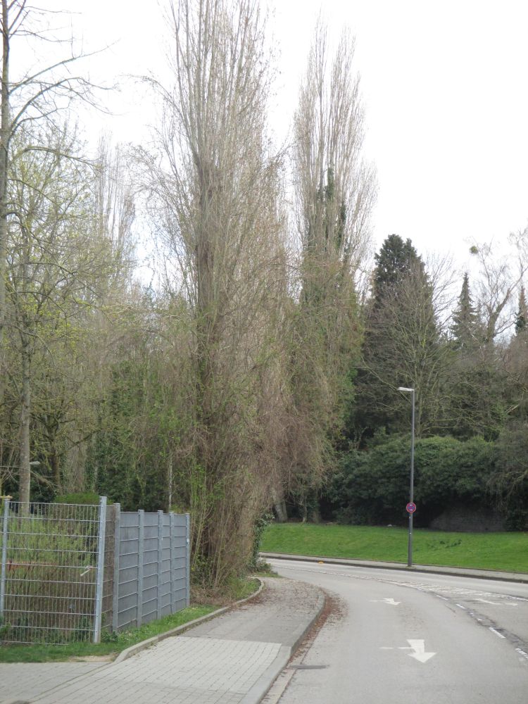 Bild 3: Pyramidenpappeln, an deren Kätzchen am 21.3.2020 in Aachen/Peliserkerstraße Raupen von X. gilvago und X. ocellaris gefunden wurden (Foto: L. Wirooks)