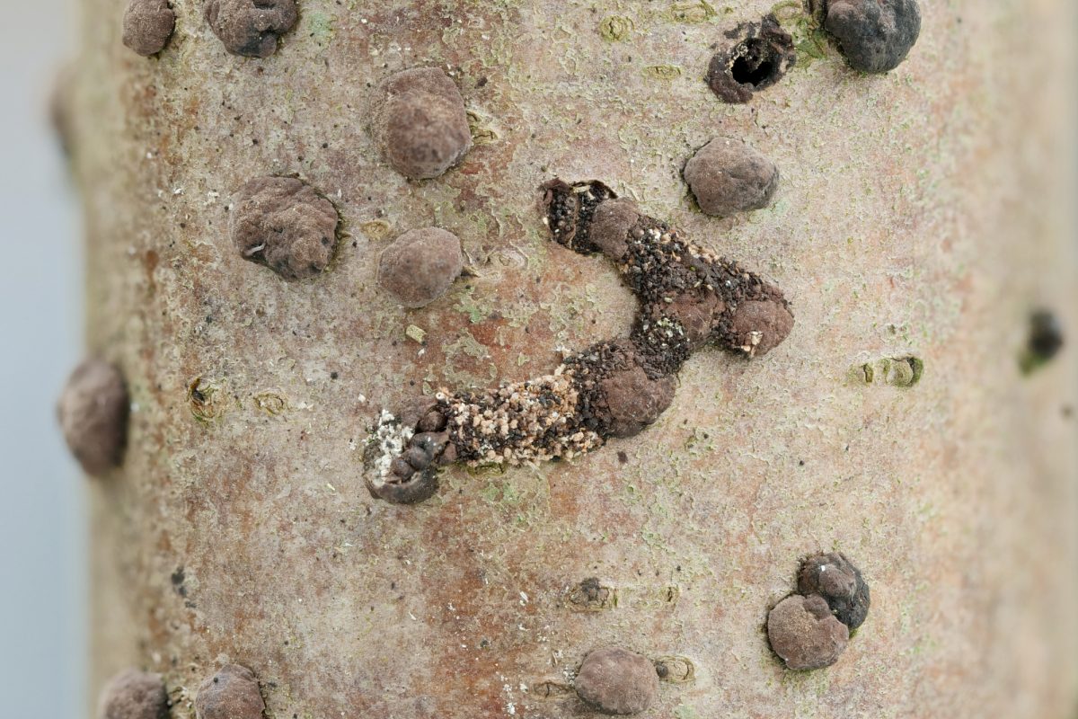 Rotbraune Kohlenbeere (Hypoxylon fuscum) an Hasel (Corylus): Nordrhein-Westfalen, Stukenbrock, 06. März 2023, mit ungeöffnetem Fraßgang von Nemapogon clematella (Fabricius, 1781) (Foto: D. Robrecht)