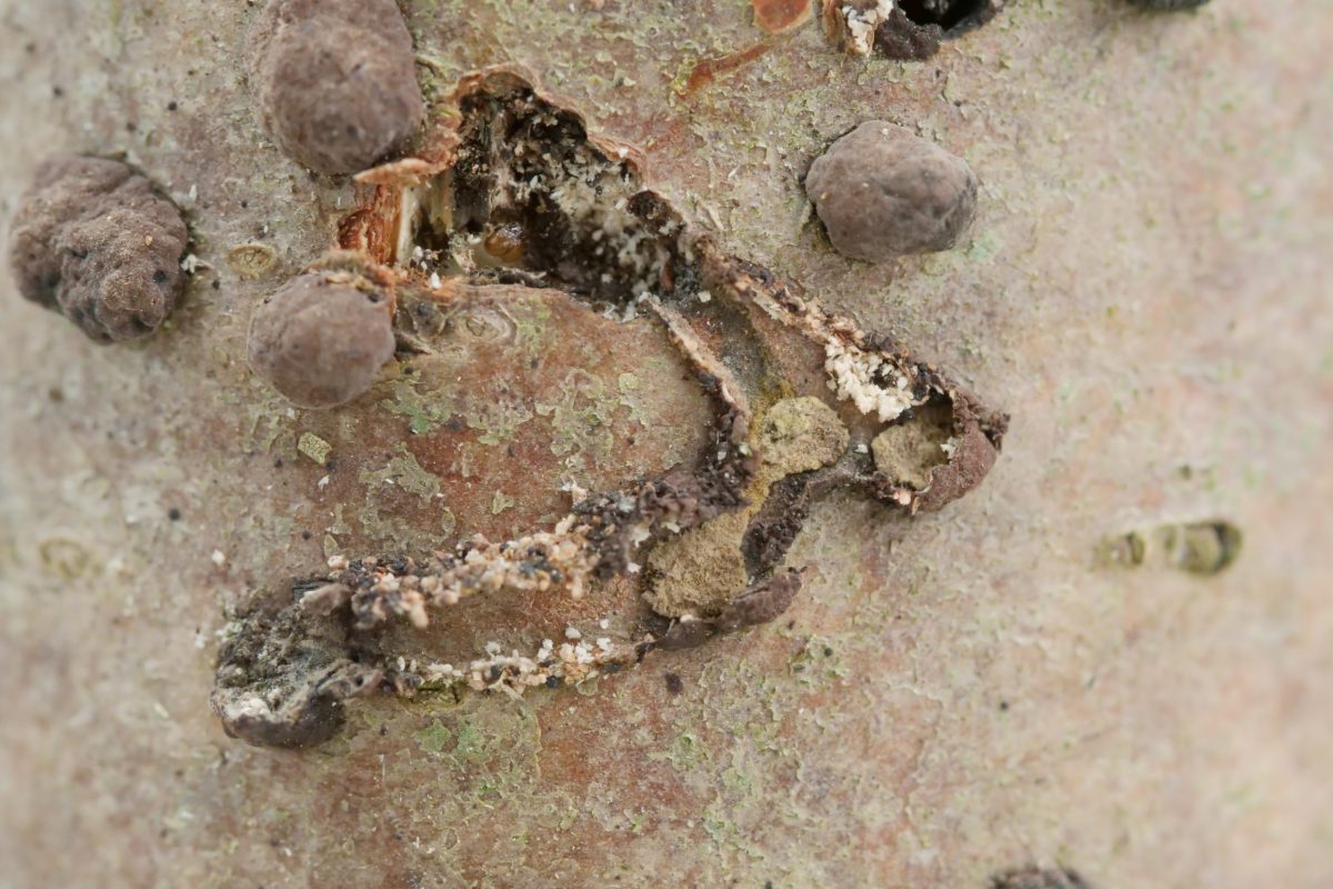Nemapogon clematella, Geöffneter Fraßgang.Links oben erkennt man den Kopf der Raupe, die den Gang sofort wieder verschließt. Der Gang zwischen den Pilzen ist nur mit Gespinstfäden ausgekleidet und mit Kot und Genagsel überwölbt. Nordrhein-Westfalen, Stukenbrock, 6. März 2023 (Foto: D. Robrecht)