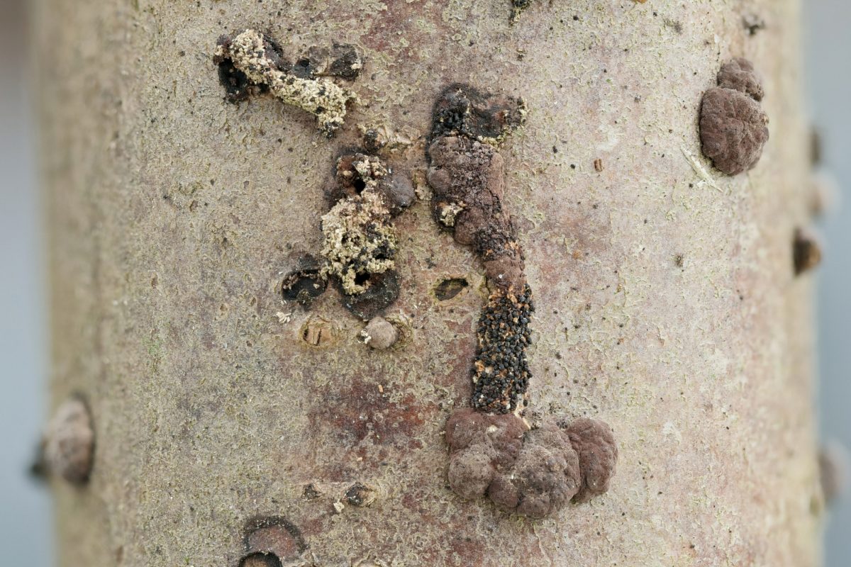 Rotbraune Kohlenbeere (Hypoxylon fuscum) an Hasel (Corylus): Nordrhein-Westfalen, Stukenbrock, 06. März 2023, zwei ungeöffnete Fraßgänge (Foto: Dieter Robrecht)