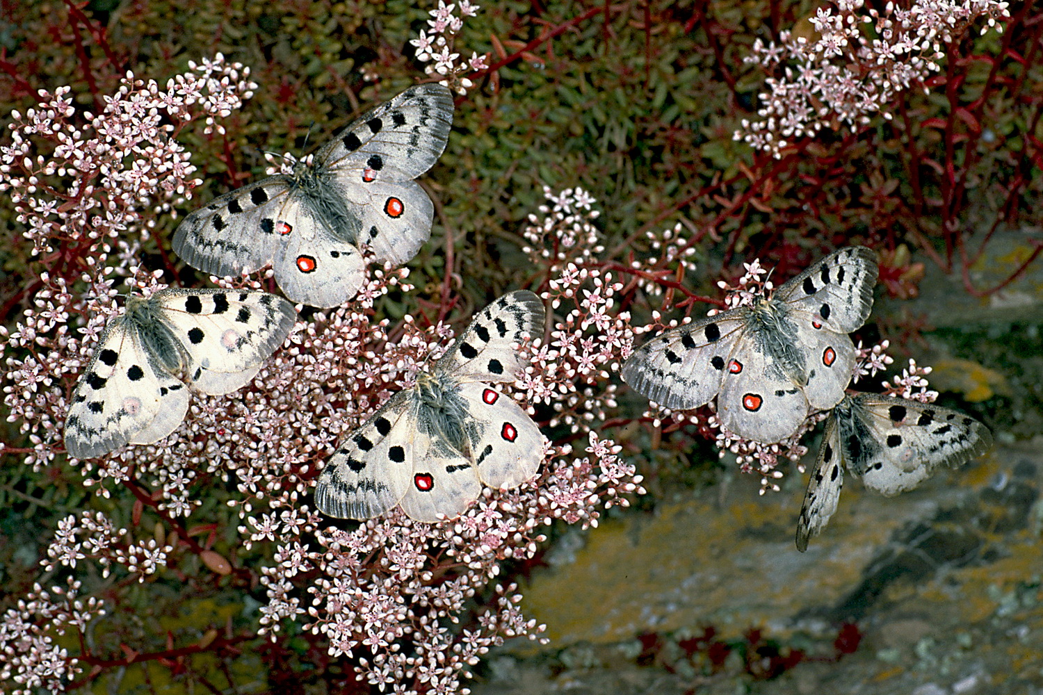 Mosel – Apollofalter 06955 Parnassius apollo (Linnaeus, 1758) Valvig (Mosel) Anfang 07.95, aufgenommen am Apolloweg, Mitte zwischen Parkplatz und Brauselay, nicht am Aussichtspunkt, Falter wurden auf ca. 10-20 m aus dem Sedum zusammengesammelt nach einem Regenguss (Gewitter)