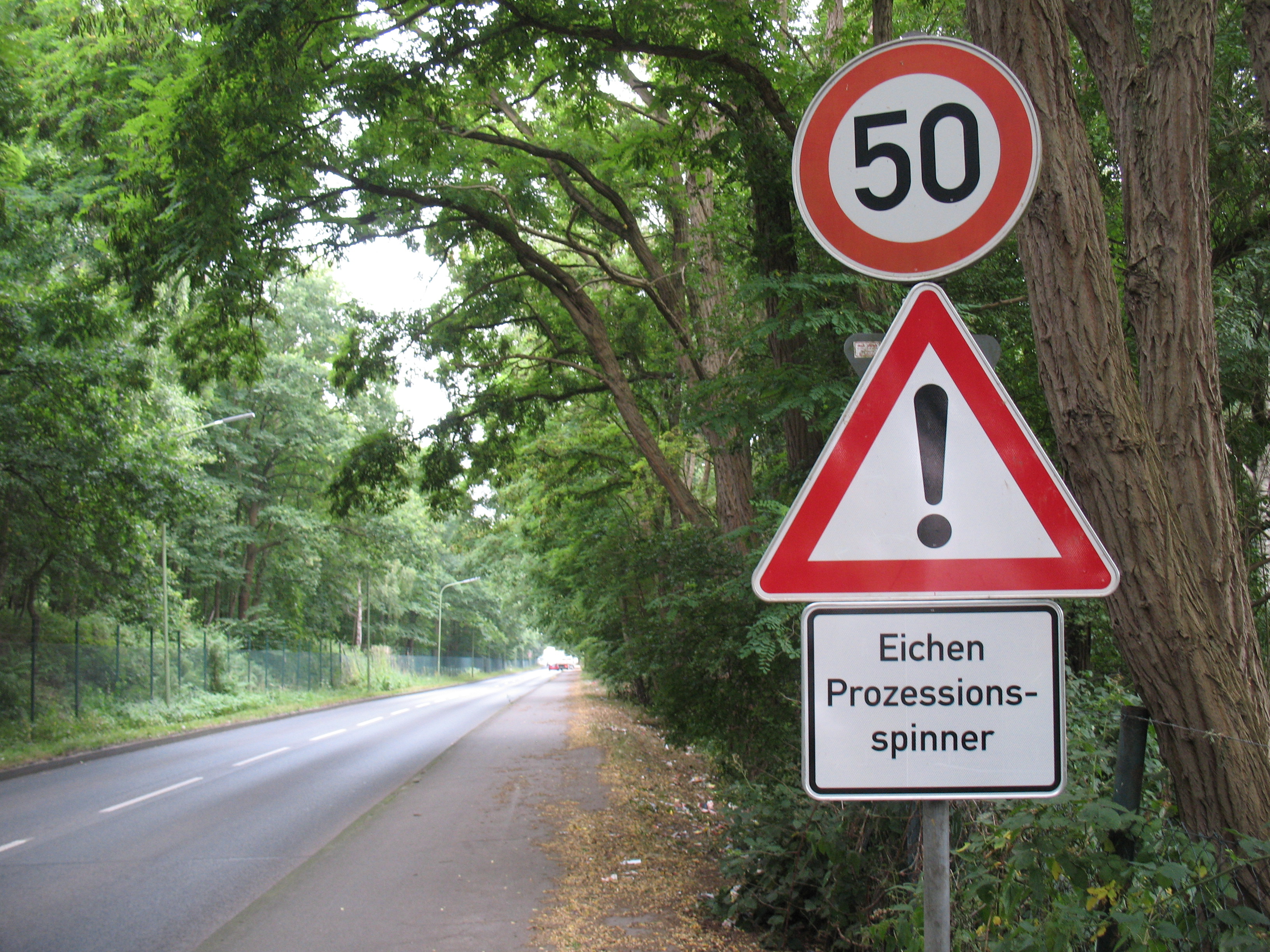 Warnung vor dem Eichenprozessionssopinner: So werden Fußgänger an Straßen sicher geschützt. (Foto: Uli Haese)