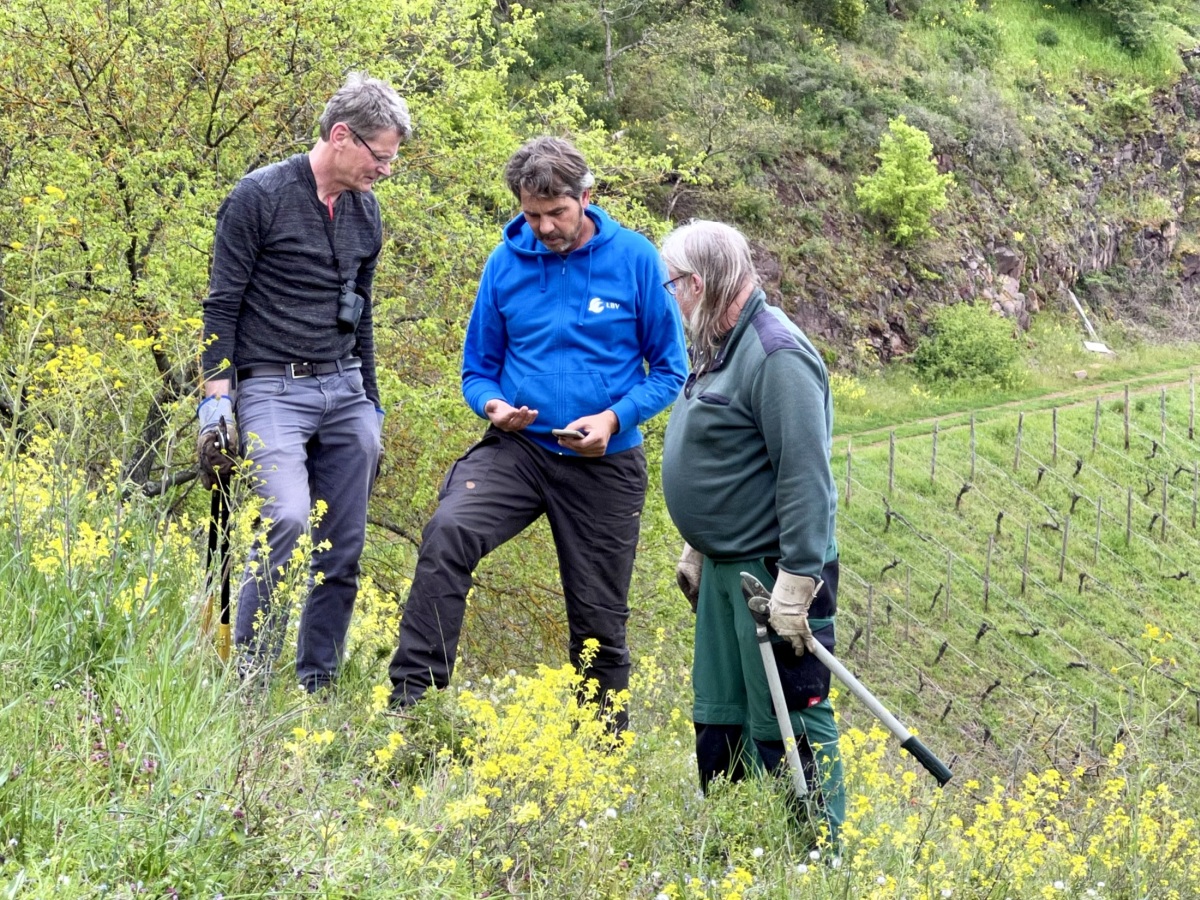 Fachgespräch auch bei der Pflege: Jörg, Bernd und Rudi diskutieren über eine Raupe (Foto: Brigitte Schmälter)