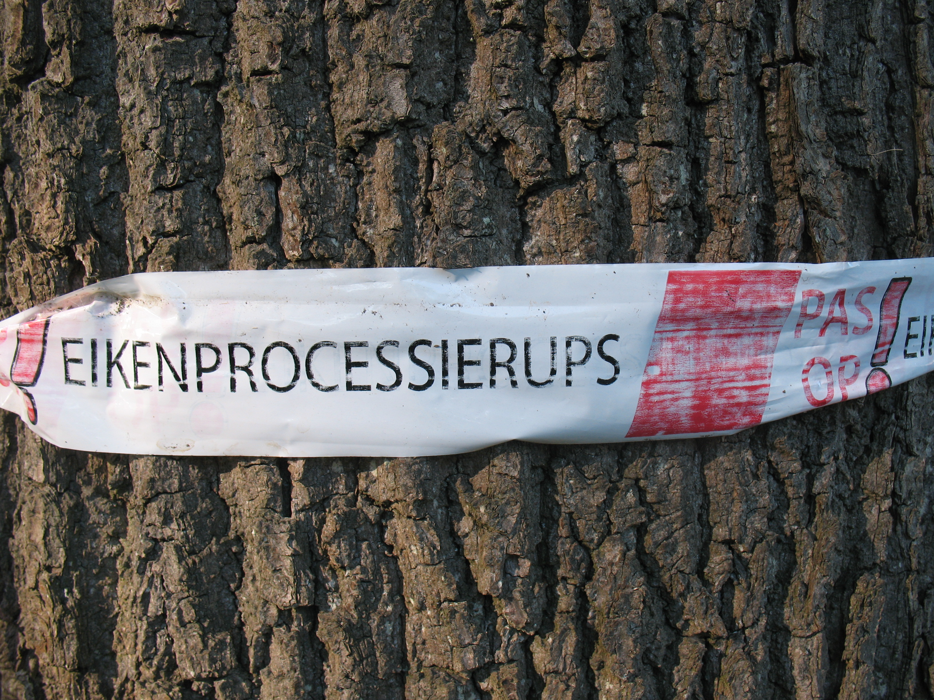 Aufpassen! Eichenprozessionsspinnerraupen! Vorbildliche Warnmarkierung mit Flatterband, an einer Eiche in den Niederlanden. (Foto: Uli Haese)